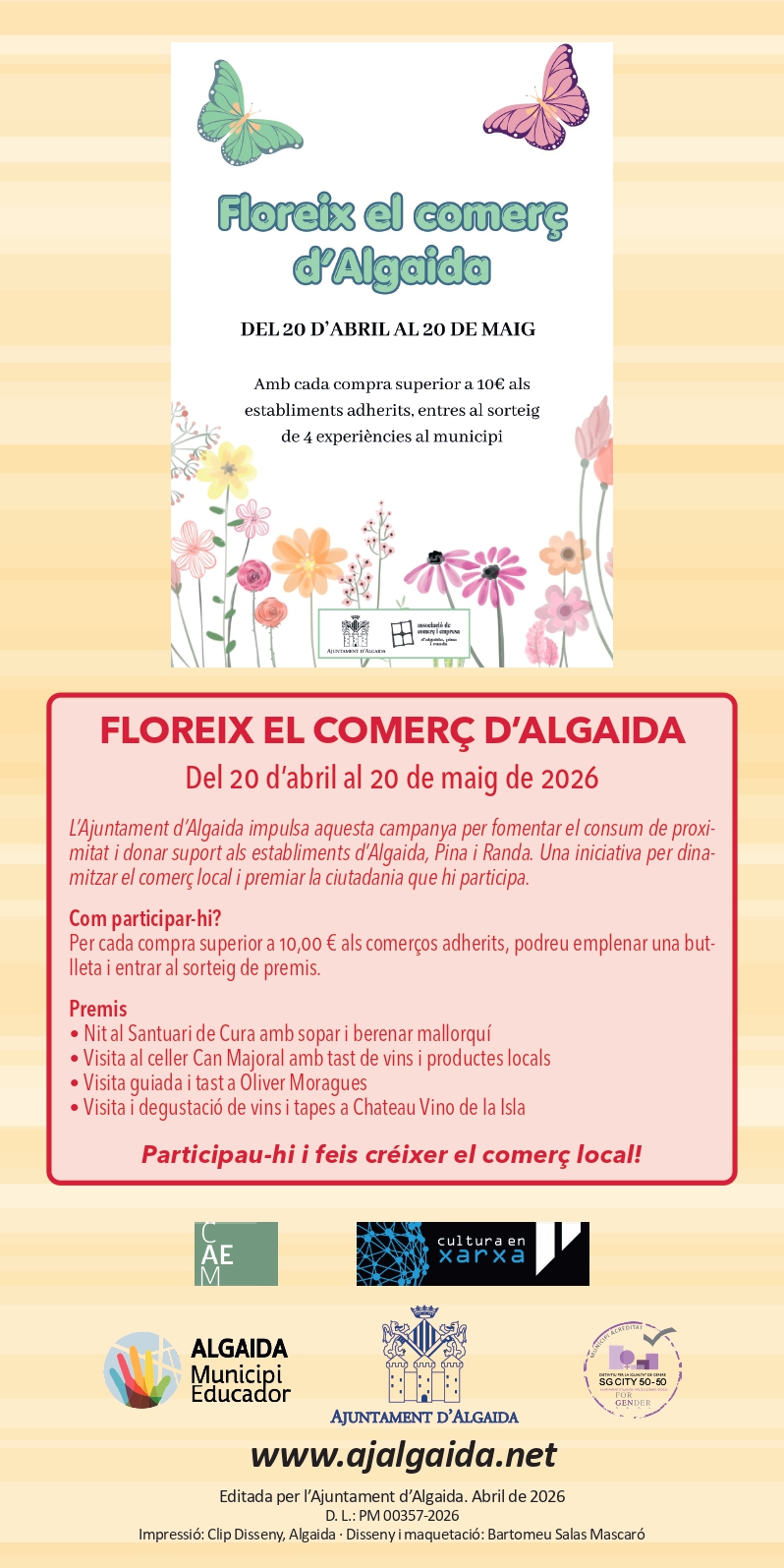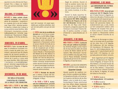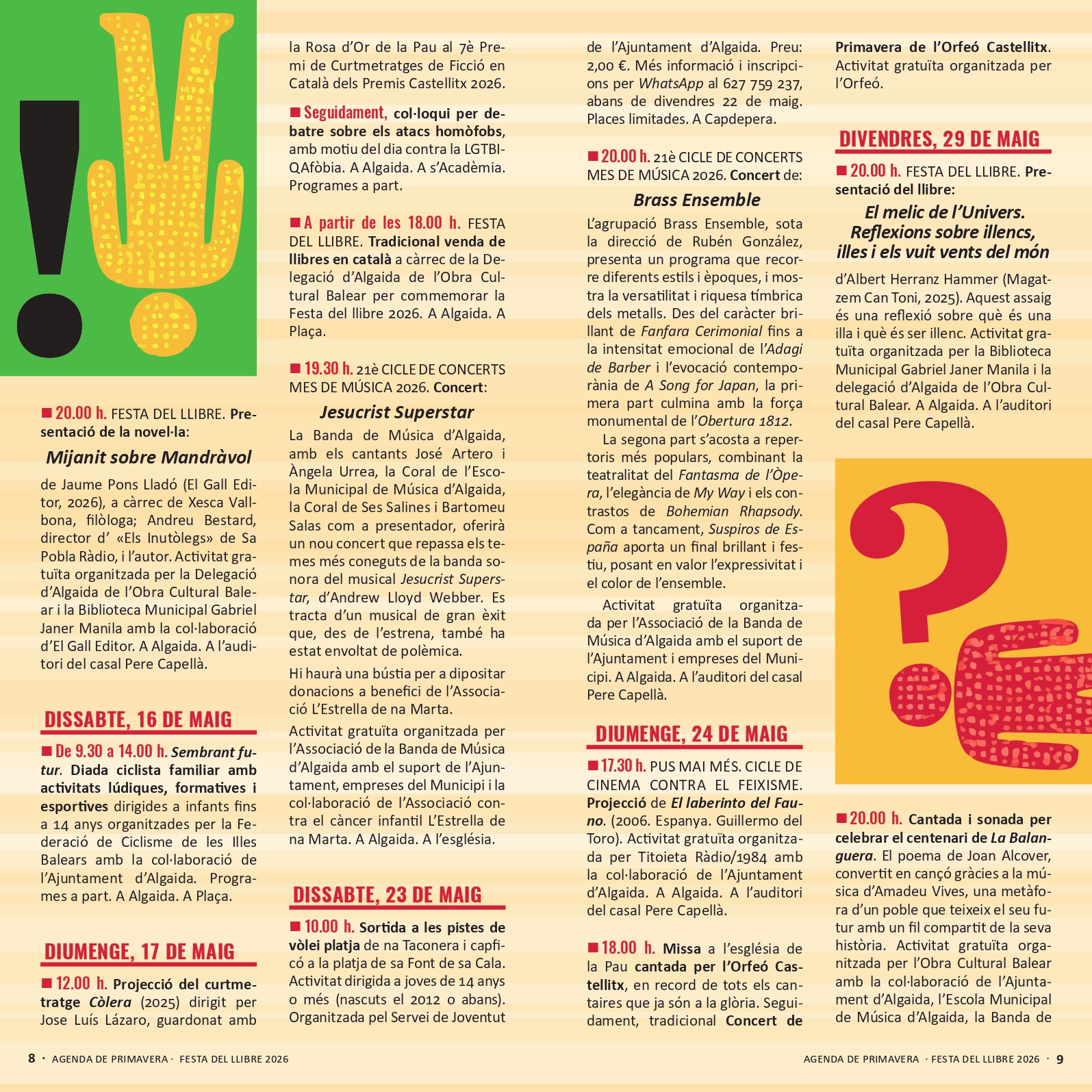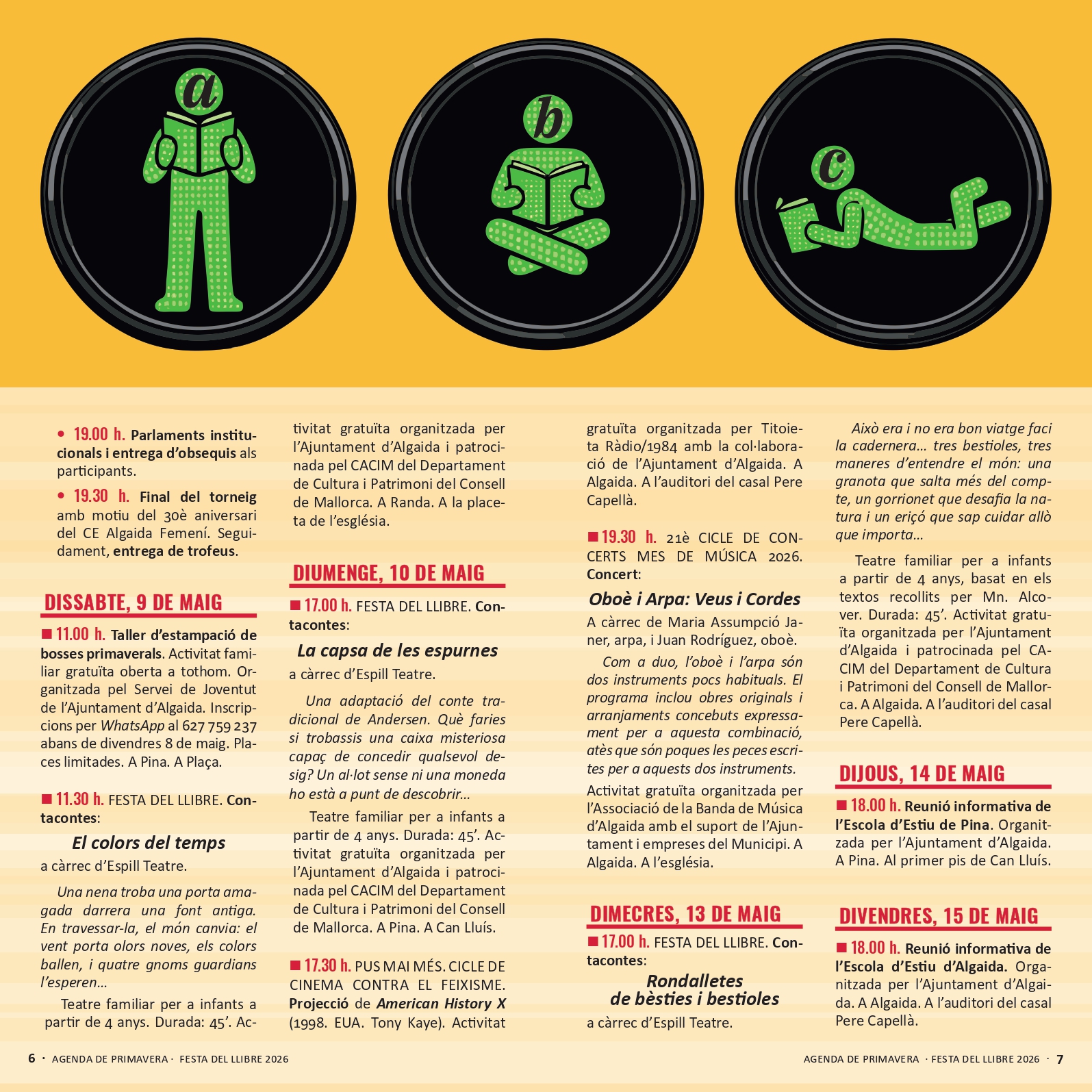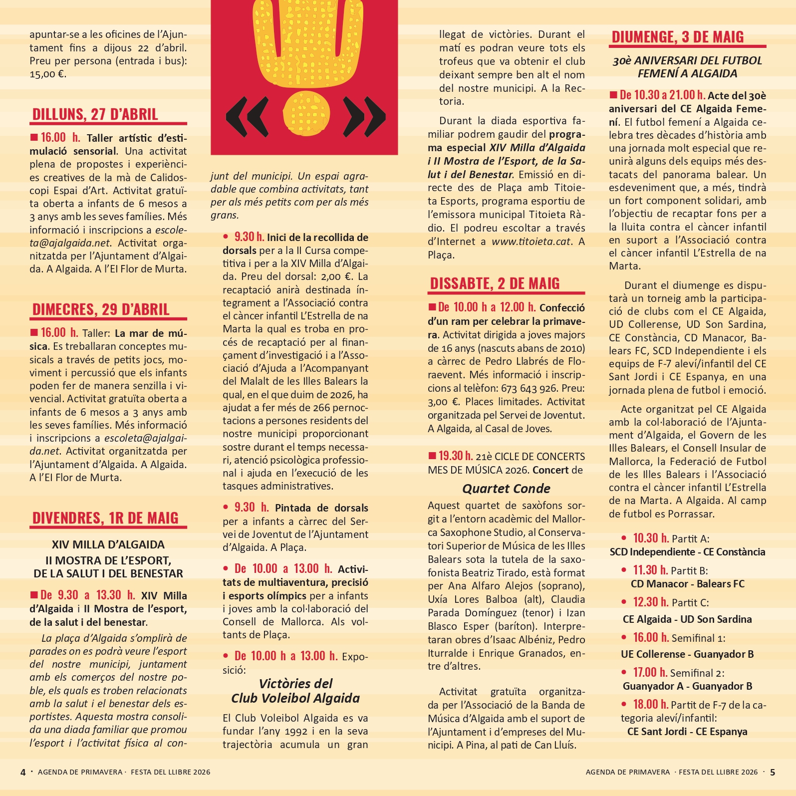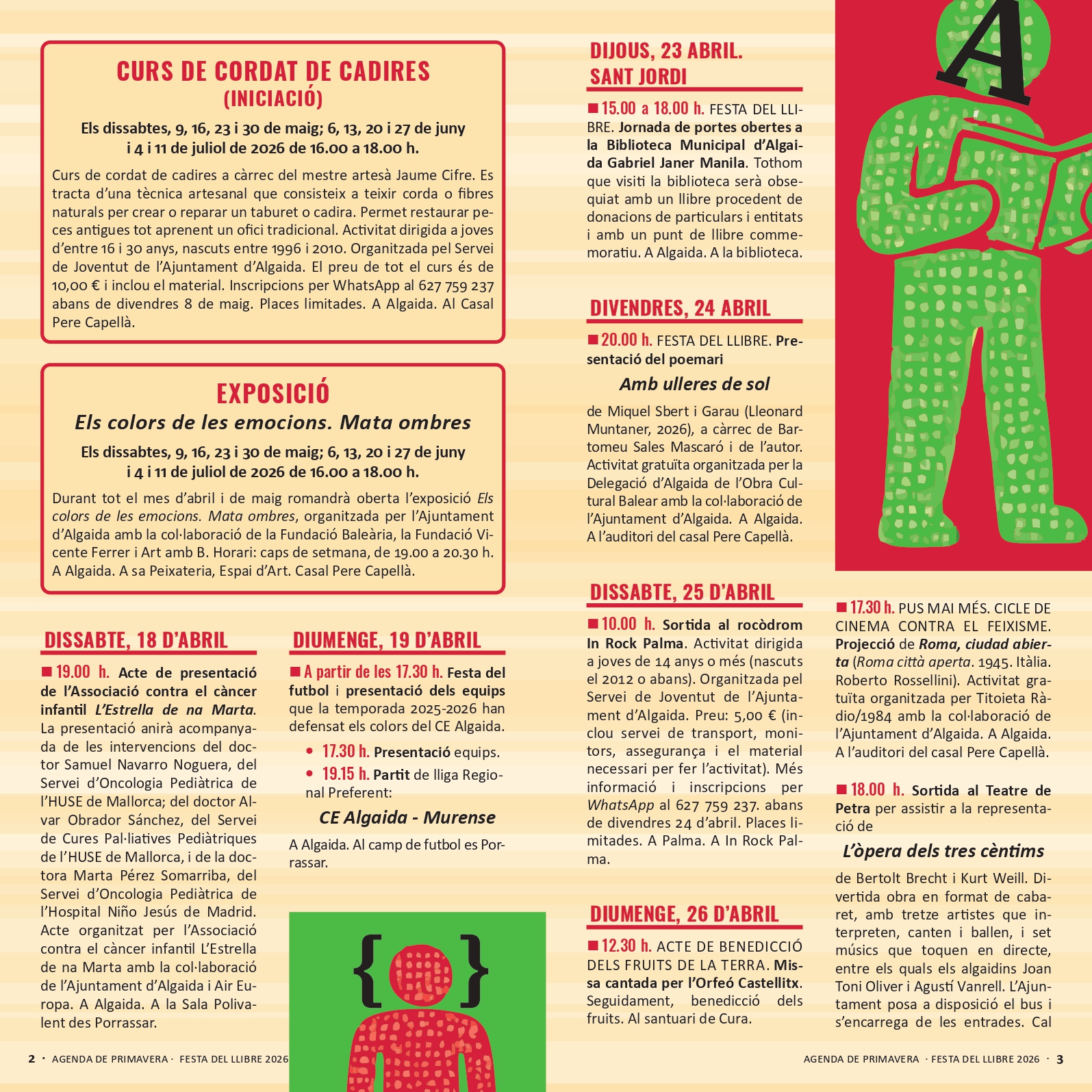 L’Ajuntament d’Algaida ha presentat la nova Agenda de Primavera i Festa del Llibre 2026, una programació que omplirà el municipi d’activitats culturals, esportives i familiars durant els mesos d’abril, maig i juny.
