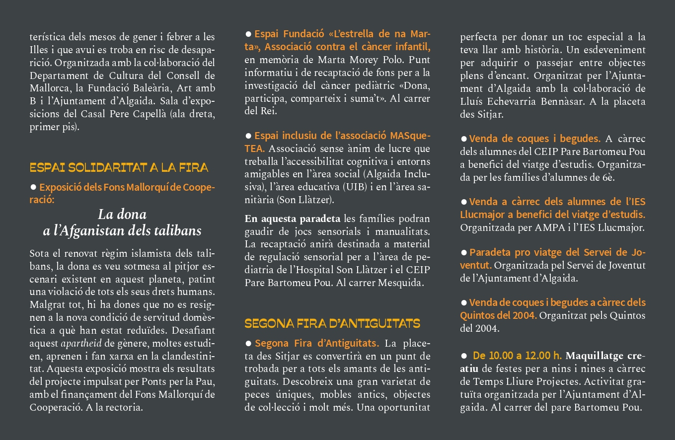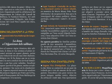 A la fira també hi haurà un espai solidari amb l’exposició ‘ La dona a l’Afganistan dels talibans’ del Fons Mallorquí de Cooperació; L’estrella de na Marta de l’associació contra el càncer infantil en memòria de Marta Moreu Polo al carrer del Rei i l’espai inclusiu de l’associació MASqueTEA.