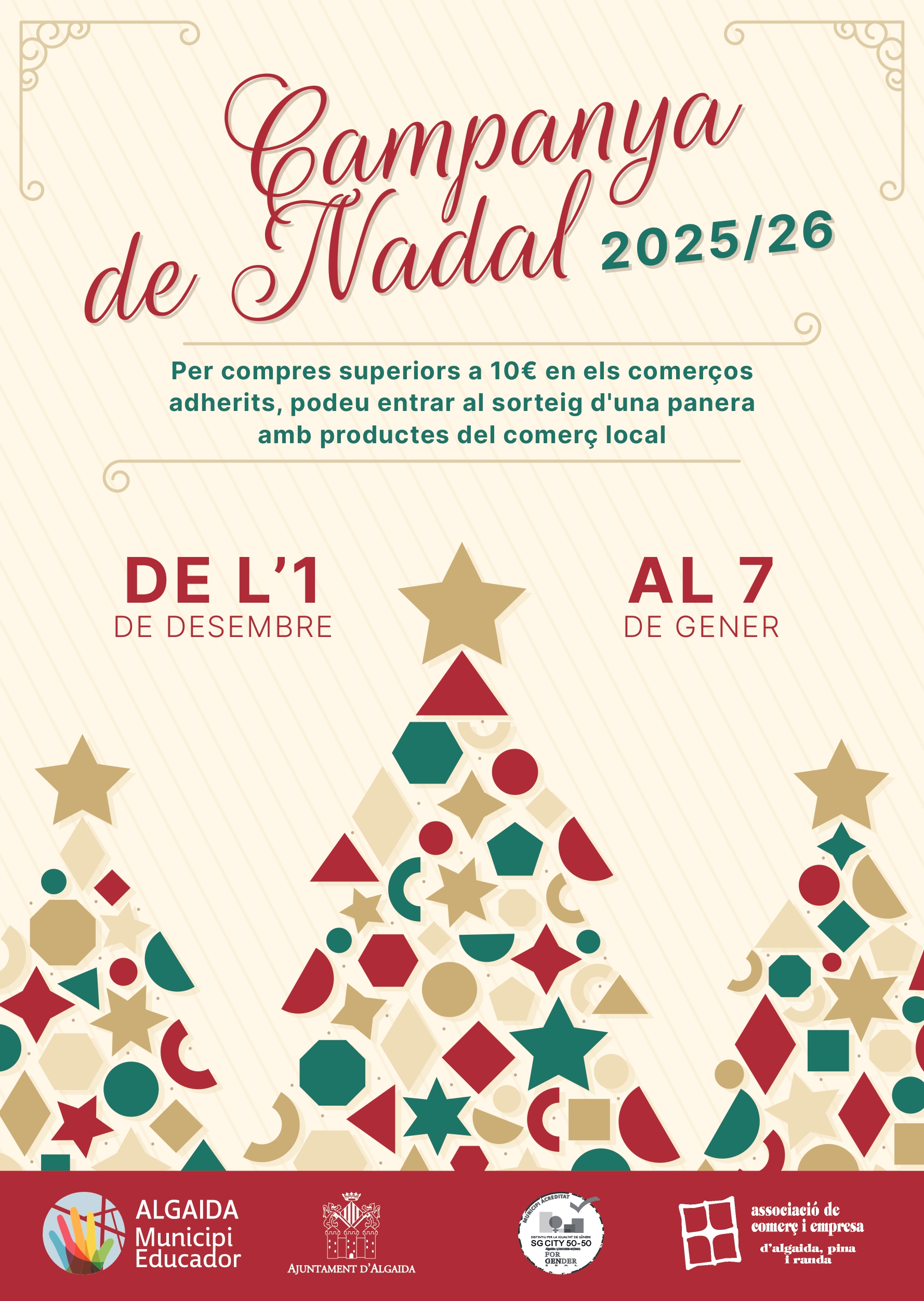 L’Ajuntament d’Algaida posa en marxa, un any més, la Campanya de Nadal del comerç local, que tendrà lloc entre l’1 de desembre i el 7 de gener. L’objectiu és incentivar les compres de proximitat i reforçar el teixit comercial del municipi durant les festes.