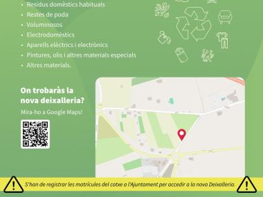 Residus permesos: domèstics habituals, restes de poda, voluminosos, electrodomèstics, aparells elèctrics i electrònics, pintures, olis i altres materials.