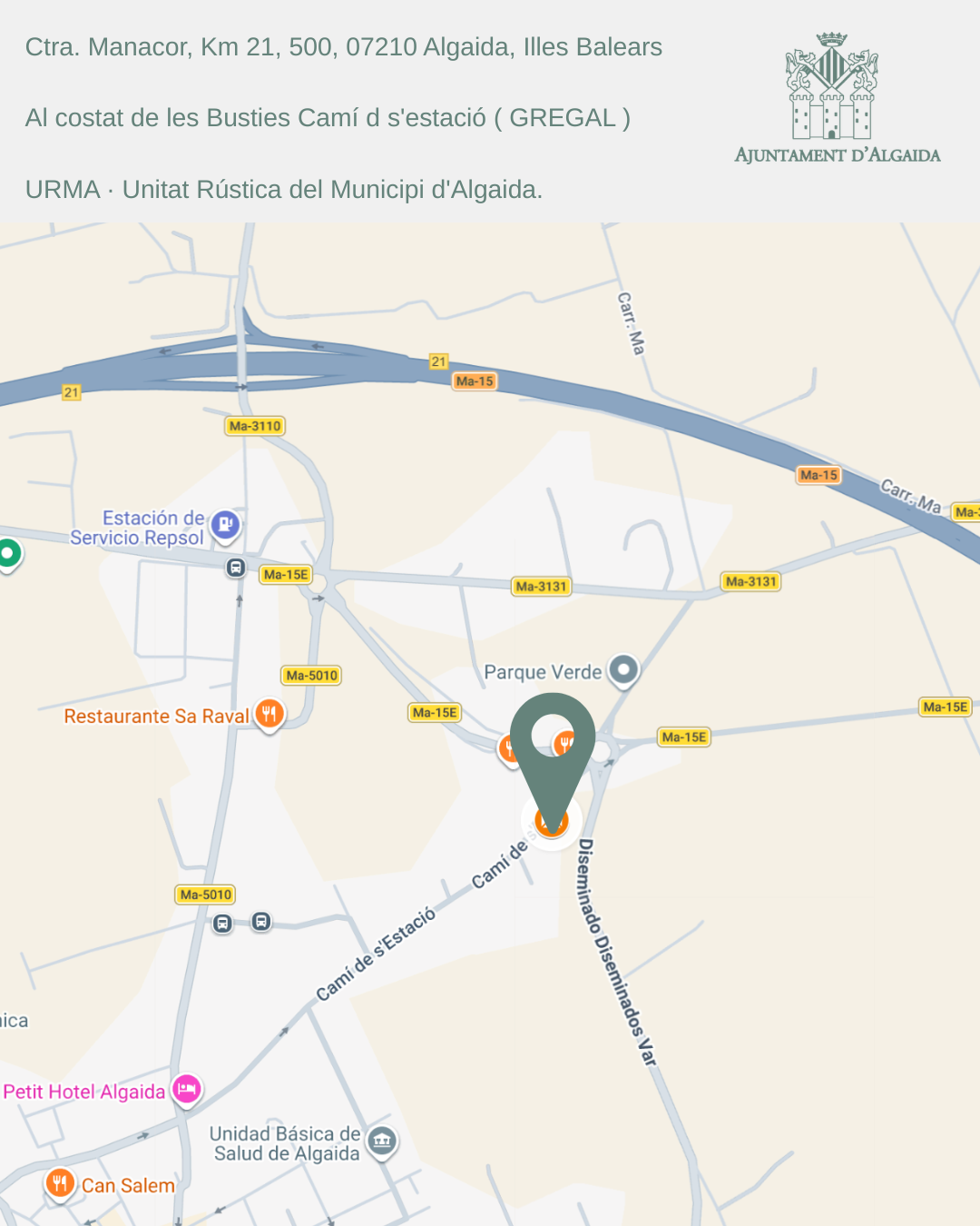 - Ctra. Manacor, Km 21,500 (al costat de les bústies Camí de s’Estació – Gregal)