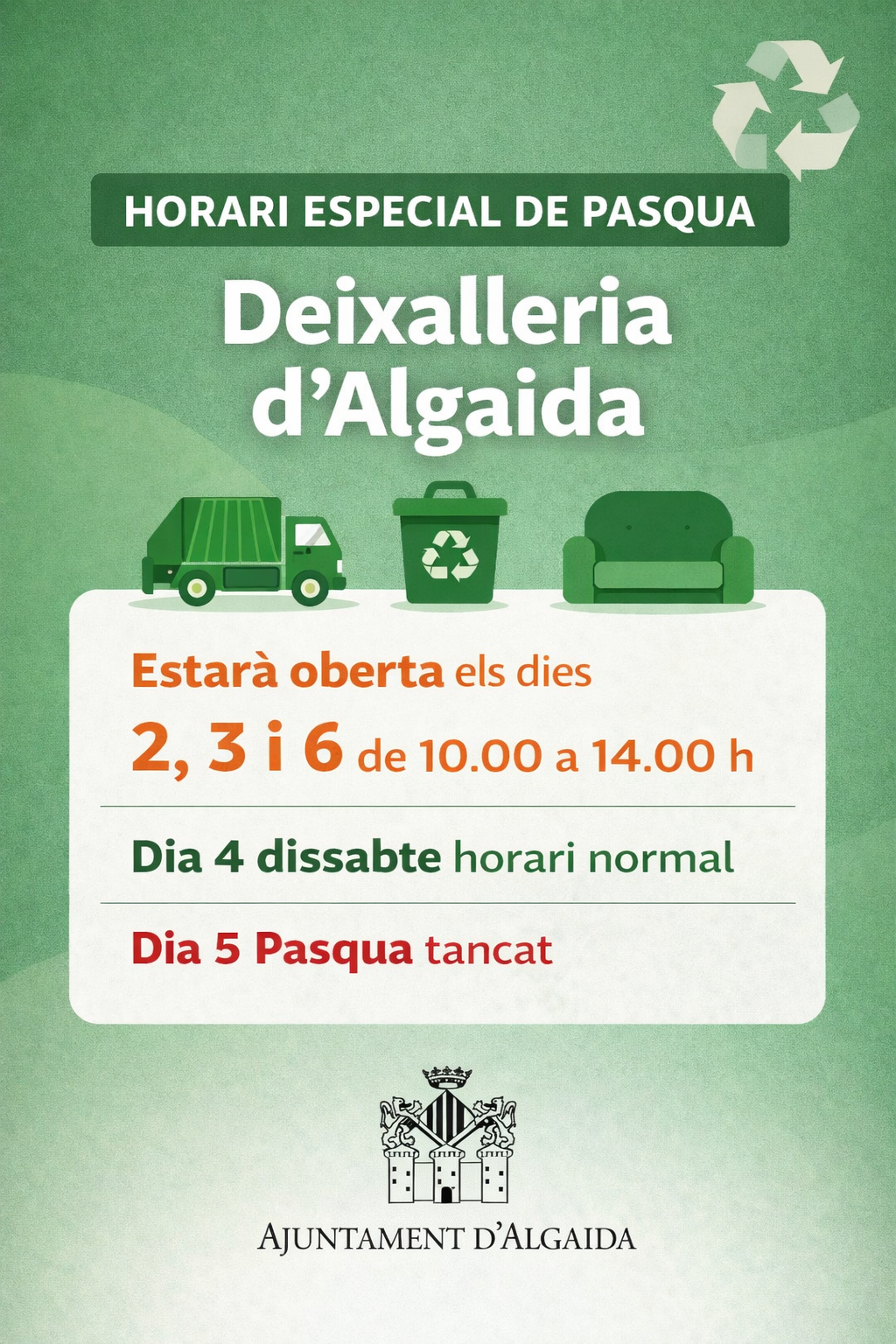 Informam la ciutadania d’Algaida, Pina i Randa que, amb motiu de Pasqua, la deixalleria municipal tendrà un horari especial:
